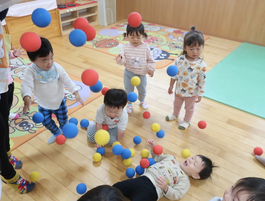 最初はスポンジボールを投げたり、転がしたりと思い思いの遊び方で楽しみましたよ! 箱の中へボールを集め⋯