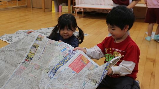 みんなで新聞遊びをしました! 大きな新聞紙の中に隠れてかくれんぼをしてみたり、ビリビリと破いてみたり⋯
