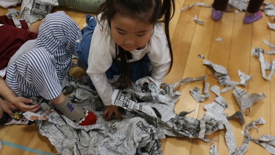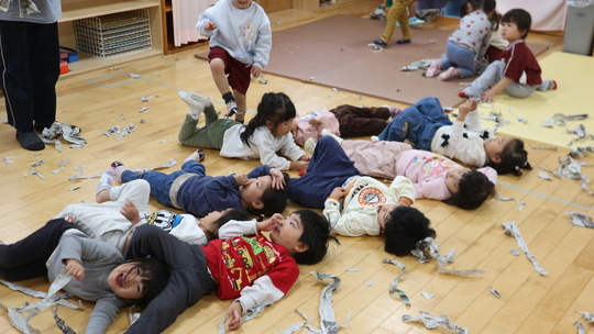 最後はみんなで床に転がってビリビリに破いた新聞紙を雨みたいに降らせてみました!